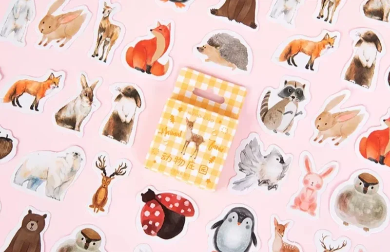 Een doosje vol met schattige stickers van bosdieren! Denk aan een vos, beer, egel, konijn, hert, eekhoorn, wasbeer, vogel en zelfs een pinguïn – allemaal in vrolijke kleuren en lieve illustraties.